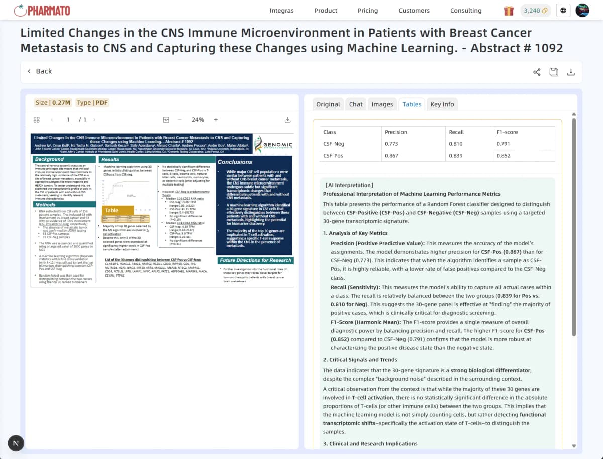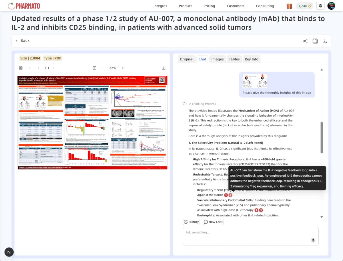 针对海报内容复杂、排版多样的特性,药番茄 Poster Lens 可自动识别各类版面并保持解析顺序,精准切割并提取标题、文字、图片与表格等有效信息。并可围绕药物、适应症、研发阶段、关键指标、研究目的与结论等关键信息进行智能提取,让复杂海报清晰明了。