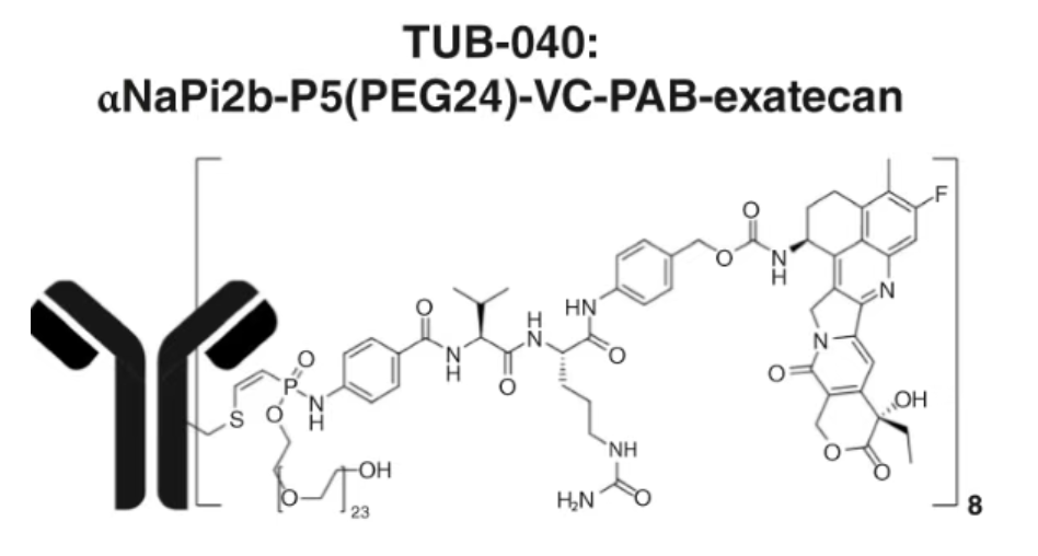 1. 潜在 Best-in-Class 管线:TUB-040这是 Tubulis 的主打候选药物,一种靶向 NaPi2b 的拓扑异构酶-I抑制剂 (TOPO1i) ADC。目前,该药物正处于 1b/2 期临床开发阶段,主要用于治疗铂耐药卵巢癌和非小细胞肺癌。2025 ESMO年会公布了TUB-040 I/IIa期研究(NCT06303505)的积极早期临床数据:截至2025年9月1日,I/IIa期研究NAPISTAR1-01共招募67例PROC患者, 1.67-3.3 mg/kg剂量队列(n=46),ORR达59%,cORR达50%,2.5 mg/kg剂量下观察到1例完全缓解(CR)。1.67-3.3 mg/kg剂量队列,确认的疾病控制率(DCR)为96%。