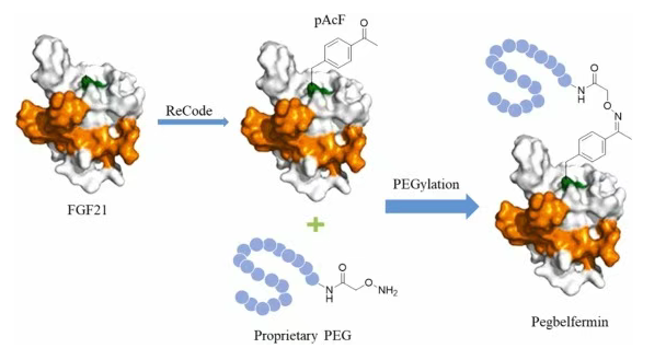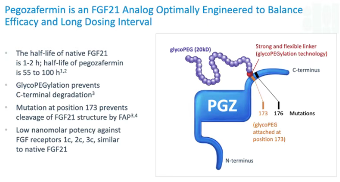 Pegozafermin采用了另一种先进的工程技术——位点特异性糖基化PEG修饰。该技术通过在FGF21蛋白的特定位点引入一个糖基链,然后再将PEG分子连接到这个糖基链上。这种方法相比传统的随机PEG化,能够更精确地控制修饰位点,从而在延长半衰期(55-100小时)的同时,最大限度地保留蛋白质的天然生物学活性。
