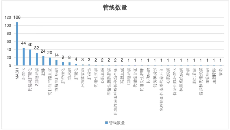 FGF21管线的疾病分布如下图,主要集中在MASH等严重肝病,其他相关疾病如2型糖尿病、肥胖、高甘油三酯血症也在被广泛研究。