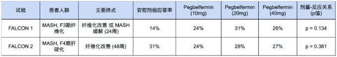 FALCON 1 结果: 该研究未能达到其主要终点。尽管在数值上,pegbelfermin治疗组(10mg, 20mg, 40mg)的应答率(24%-31%)高于安慰剂组(14%),但这种差异并未达到统计学显著性。更关键的是,研究未能观察到清晰的剂量-疗效关系(p=0.134),即更高剂量的药物并未带来更好的疗效。