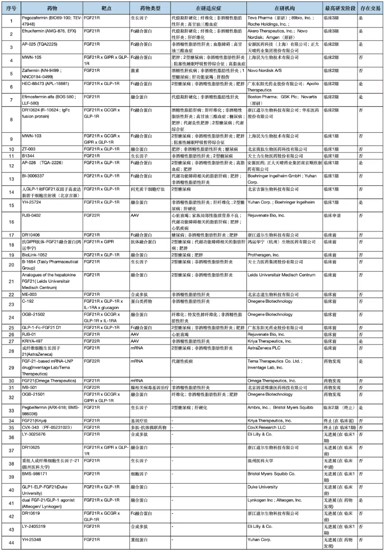 FGF21的治疗前景在经历了多年的探索和挫折后,正迎来一个决定性的复兴时期,制药巨头纷纷布局。如下表所列,全球FGF21研发管线总共44条,其中在研管线32条。