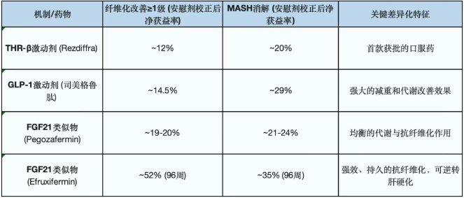 vs. 甲状腺激素受体-β (THR-β) 激动剂 (Rezdiffra/Resmetirom): Madrigal公司的Rezdiffra是首个获FDA批准用于治疗MASH的药物。然而,其疗效被认为是中等水平:在关键的MAESTRO-NASH试验中,实现纤维化改善(≥1级)的患者比例约为26%,而安慰剂组为14%,安慰剂校正后的净获益约为12%。同时,Rezdiffra也伴有胃肠道副作用。多项网络荟萃分析表明,FGF21类似物在MASH消解和纤维化改善这两个关键组织学终点上的疗效均优于THR-β激动剂。因此,FGF21类药物的定位是疗效更优的注射类药物,而Rezdiffra则凭借其口服便利性占据特定市场。