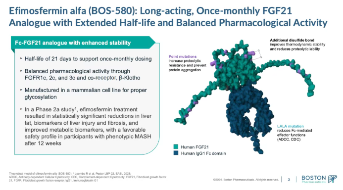 Efimosfermin是一种长效FGF21变体,通过与人IgG1的Fc片段融合而构建。其工程设计的重点在于提高热力学稳定性和延长半衰期,最终实现了每月一次的皮下注射给药方案。这一给药频率在慢性病治疗中具有显著的商业优势,能极大提高患者的依从性。
