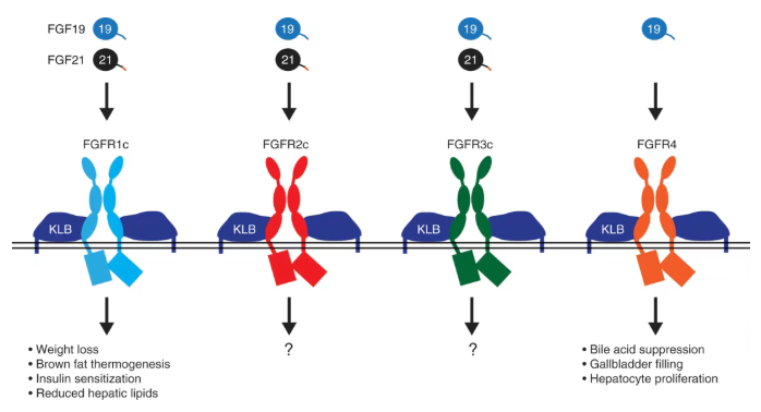 FGF19 和 FGF21 可激活与必需辅助受体 KLB 结合的同型二聚体FGFR酪氨酸激酶。FGFR1/KLB激活的下游效应已得到充分研究,但 FGFR2/KLB和FGFR3/KLB的作用尚不清楚。FGF19 独特地激活FGFR4/KLB复合物,并引发与 FGF21 受体不同的下游效应。