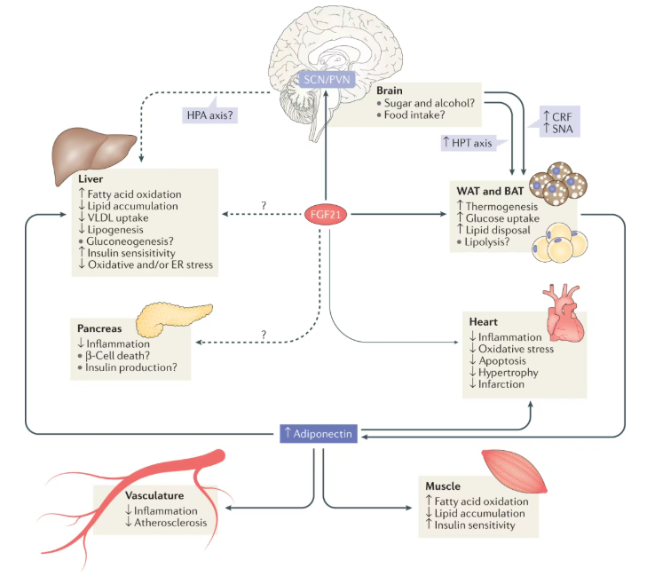 FGF21并非一个普通的生长因子,而是一种在代谢应激(如禁食)期间由肝脏分泌的内分泌激素。它像一位信使,向全身发出信号,指令身体启动一系列生存攸关的适应性反应:燃烧脂肪、提高胰岛素敏感性、抑制炎症。