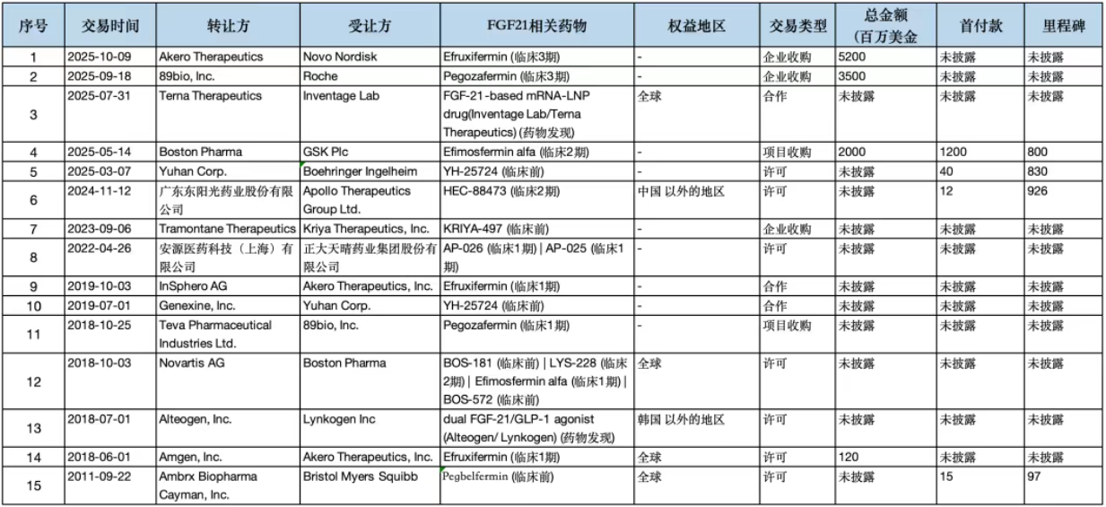 目前公开的关于FGF21赛道相关交易如下表,总共15笔交易,披露总额超过108亿,基本都发生在2025年。