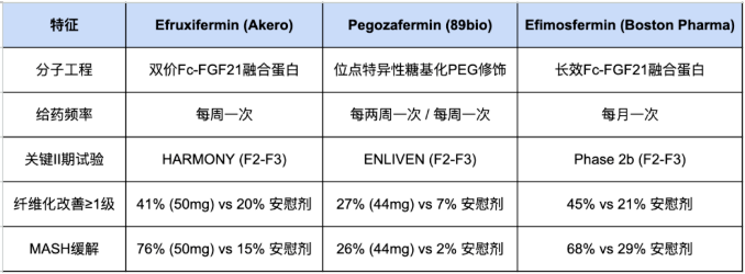 在FGF21单药治疗的后期开发阶段(Phase 3),竞争格局呈现“双雄争霸”:89bio公司(被罗氏收购)的Pegozafermin和Akero Therapeutics(已被诺和诺德收购)的Efruxifermin。这两种药物展现出差异化的临床特征:Pegozafermin以其在肝脏和全身代谢方面的“均衡代谢”优势而著称,而Efruxifermin则凭借其强大的、甚至可逆转肝硬化的“纤维化优先”疗效脱颖而出。