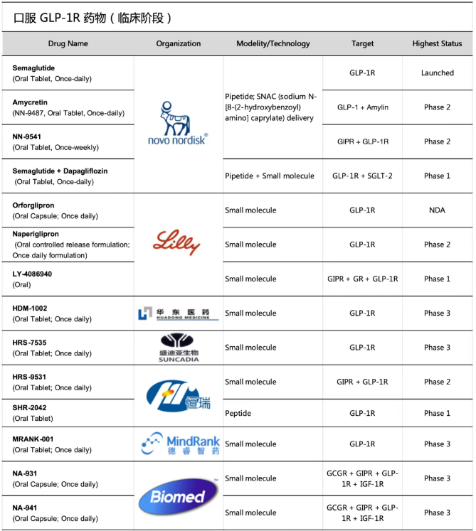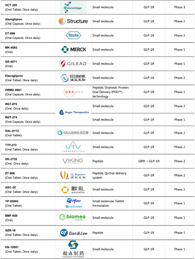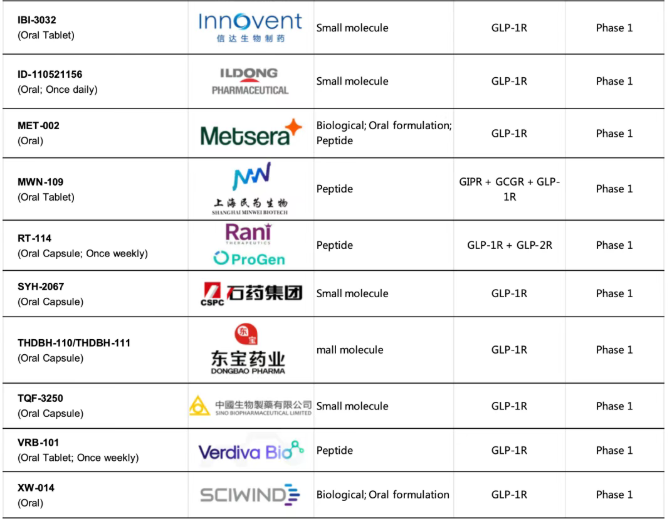 如下整理的临床阶段口服GLP-1在研药物列表: