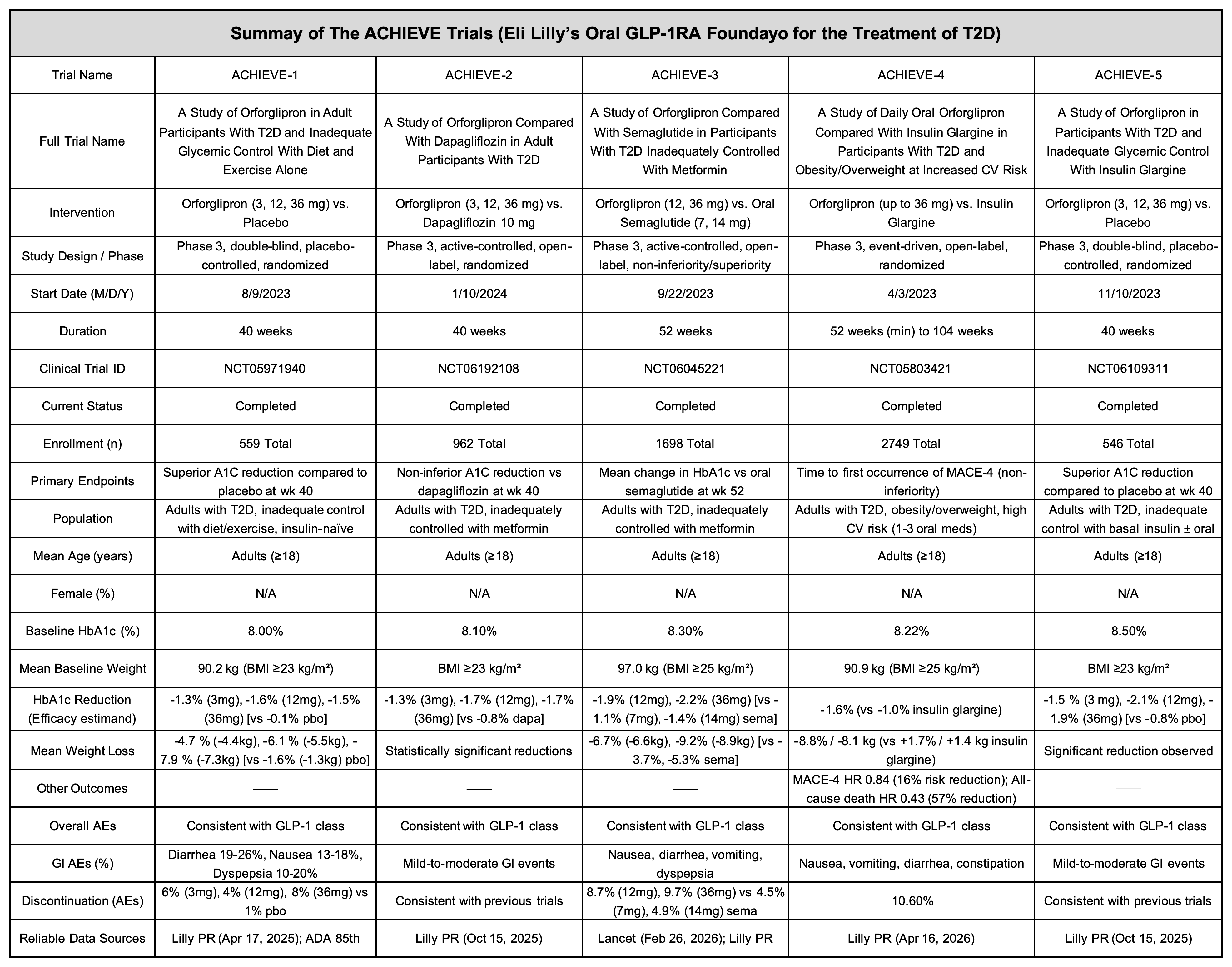 Orforglipron 在ACHIEVE系列临床试验中,展示了其作为新一代二型糖尿病治疗基石的实力。随着礼来在2026年向美国FDA及全球各大监管机构陆续提交NDA,Orforglipron 将引领二型糖尿病的治疗进入一个高效、口服、无缝依从的时代。