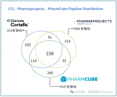 在构建管线竞争情报时,单一数据库往往存在信息不全,而多数据库的交叉比对又极其痛苦。数据字段不统一、靶点命名规则各异、重复数据极多……如下图,以“小细胞肺癌”的管线为例,如下是Cortellis、Pharmaprojects和医药魔方导出的新药管线的包含关系,每个数据库涵盖的数据都是不全面的,如果希望获得全面的管线竞争情报,需要对多家数据进行合并。