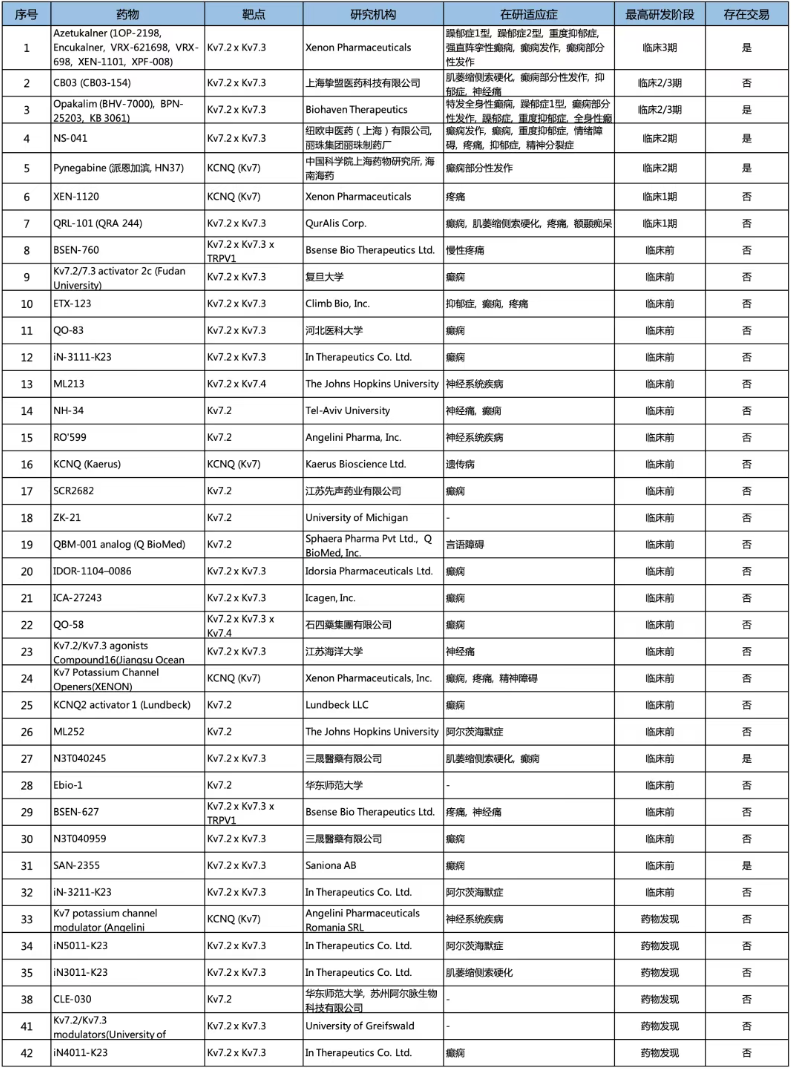 全球Kv7研发管线呈现出“一超多强”的局面。目前有42条管线处于研发状态,最快的Azetukalner (XEN1101) 针对癫痫、MDD等适应症正在同步开展3期临床,挚盟医药、Biohaven、纽欧申、上海药物研究所的管线紧随其后。总体管线情况如下表: