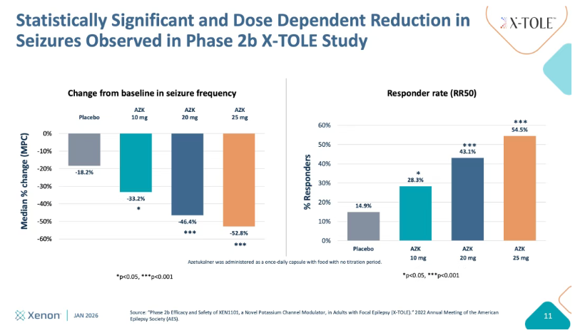 商业机会: 临床试验 X-TOLE 已经证明,在患者已服用1-3种抗癫痫药无效的情况下,叠加XEN1101仍能显著减少发作。这意味着Kv7药物上市后,可以迅速切入广大的二线、三线辅助治疗市场,无需等待成为一线单药。