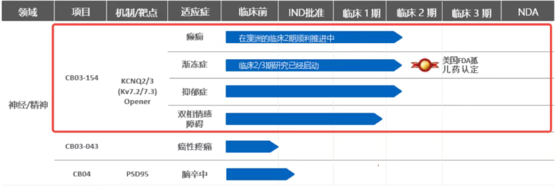 挚盟医药自主开发的 CB03-154 一种钾离子通道KCNQ2/3(Kv7.2/7.3)激活剂,用于治疗难治性癫痫、渐冻症(ALS)、抑郁症和双向情感障碍等患者。2023年,CB03-154获得FDA的ALS孤儿药认证。公司拟首先在中国开展治疗ALS的临床研究。