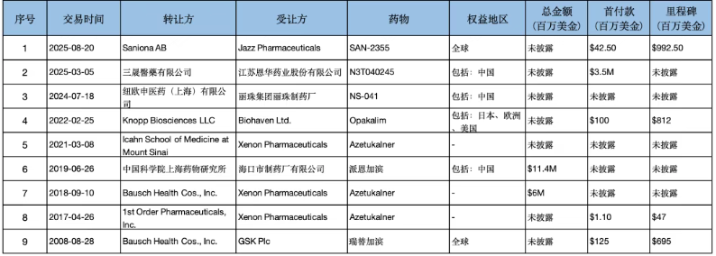 Kv7钾离子通道领域的交易情况如下,能够监测到的交易总共9笔,2021年-2025年发生5笔交易,首付款千万美金~1亿美金不等,未来的交易可能会更多关注中国资产的出海。