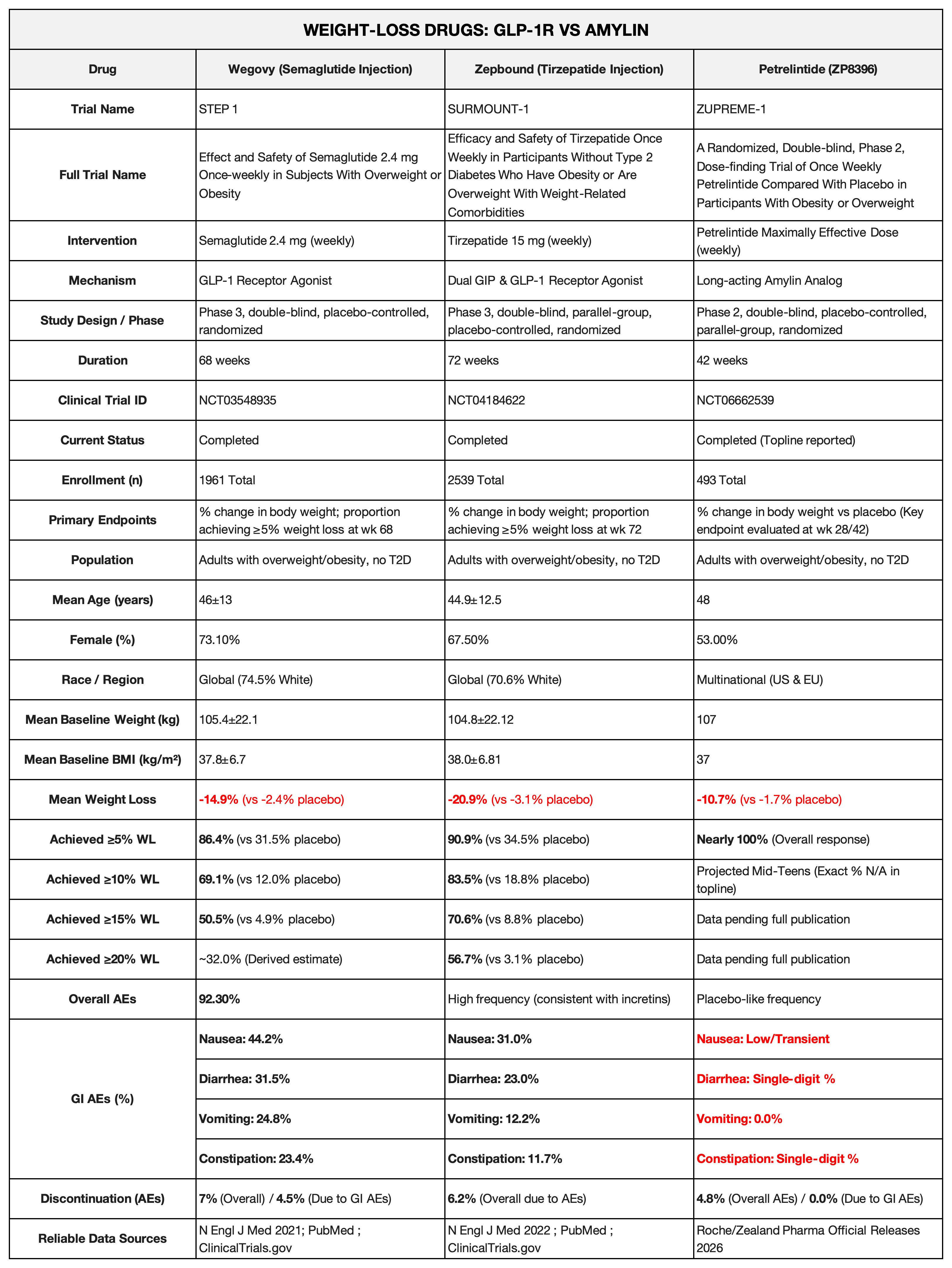 三月份,罗氏与Zealand Pharma联合公布了其共同研发的新型胰淀素类似物(Amylin analog)—— Petrelintide的Ⅱ期临床试验(ZUPREME-1)的积极数据。