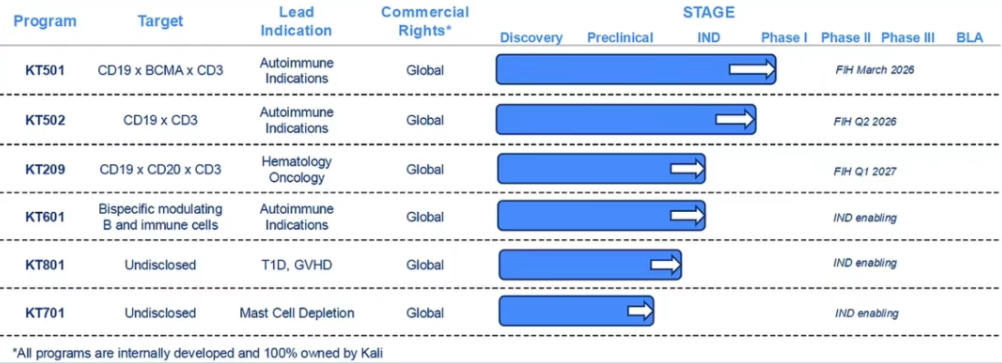 除了KT501,Kali的管线中还储备了其他两款TCE产品,包括另一款三特异性抗体,以及计划于2026年上半年推向临床的靶向CD19 TCE药物KT502。
