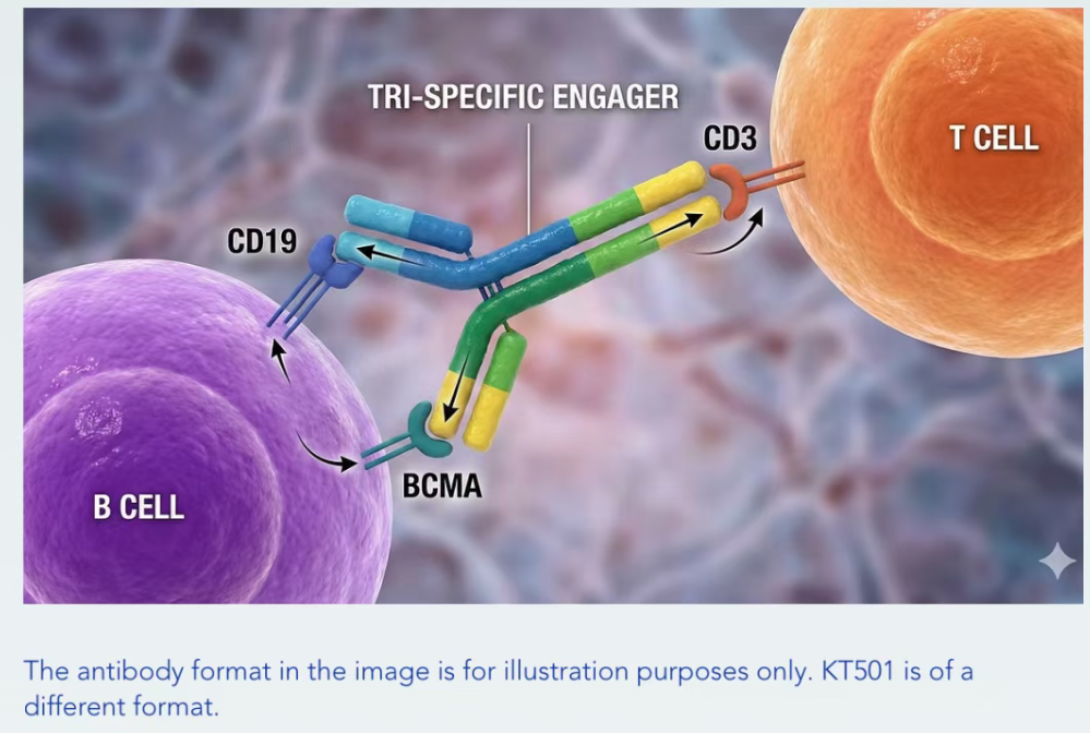 此次被赛诺菲重金相中的KT501,是一款处于临床阶段的创新型IgG样三特异性抗体。它的独特之处在于能够同时结合三个靶点:T细胞上的CD3,以及B细胞谱系上的CD19和BCMA。